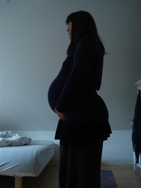 For det andet er jeg idag 34 uger henne med vores Baby Juhl. Vi var til sidste lægeundersøgelse igår - alt var fint med mor og barn og Far var vist bare glad og stolt og spændt. Baby Juhl har stadig hovedet godt nede i bækkenet. Dog har den taget sig en "glider" - det kan den godt lide, altså lige at køre numsen henover maveskindet, så jeg har det som om jeg falder forover - og fået måsen over til højre. Det betyder at højre bryst, ribben og lunge får en tiltrængt pause fra små fødder der nogle gange (især når Far snakker) blir så glade, at jeg som modtageren af spark ikke synes det er lige fedt at være gravid hele tiden