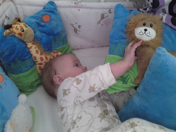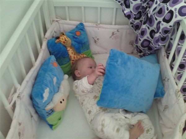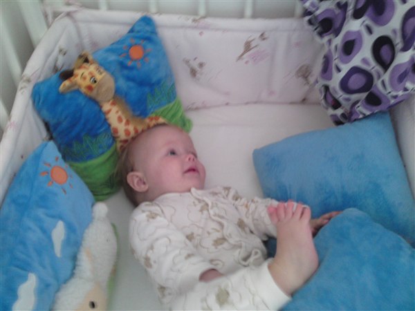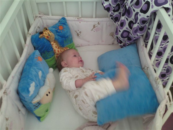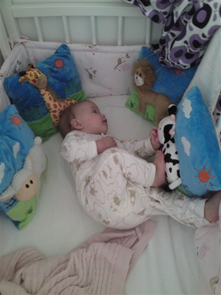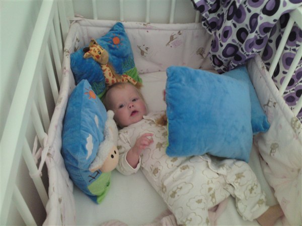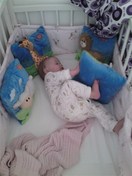 Min lille feber/snot baby er lige vågnet fra sin formiddags lur og jeg lagde hende derfor med hovedet i fodenden så hun kunne tale lidt med sine puder