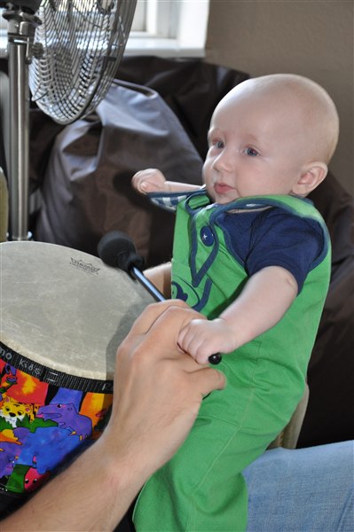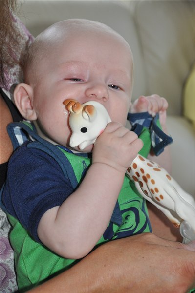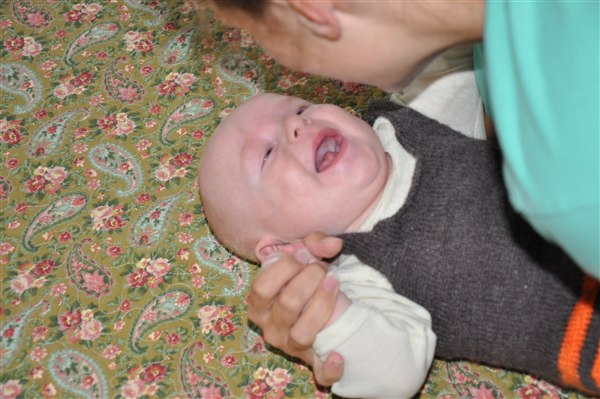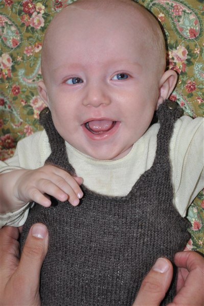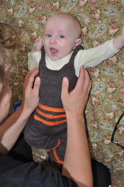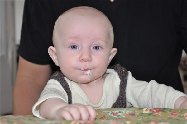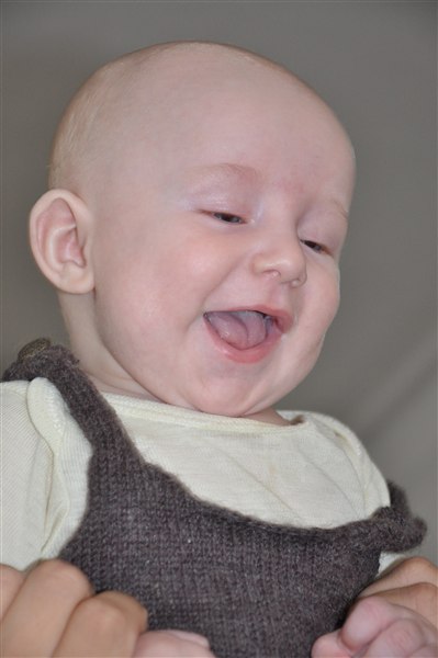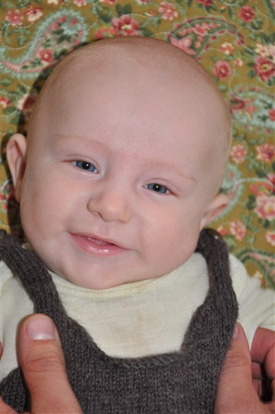 Sundhedsplejersken var her i dag og kunne konstatere at han nu måler 65cm og vejer 6,8 kg - så det er liiige under snittet, men helt OK. Med grød, mos, flaske og natamning vokser han sig større og gladere hver eneste dag, og hans jubelskrig bliver flere og flere, sammen med spytboblerne der springer, antallet af hår han rykker af mig (og katten - stakkels Sigrid), prutterne og de reelle kilo bajs han fylder i bleer