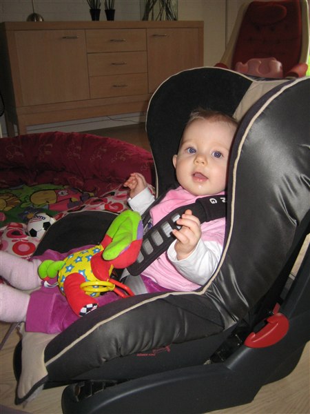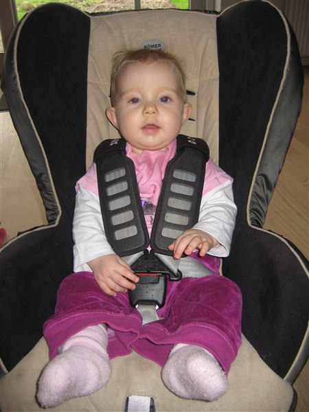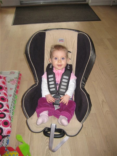 Min pige bliver snart 9mdr. og vejer ca 9,5 kg. så det varer nok ikke mere end en lille måneds tid før hun skal op i en større autostol.