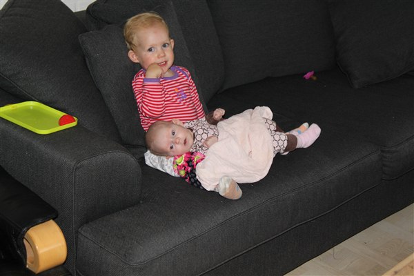 Freja elsker sin lillesøster. Hun vil gerne nusse og kramme hende og sidde med hende hele tiden, og hun deler gerne både sut, krammeble og pølsehorn med hende. Hun har dog en lille smule svært ved at forstå at Silja ikke er vild med pølsehorn??? Når hun vågner om morgenen er det første hun siger "Siija?" og når Silja græder er det "Siija shyyy, shyyy". Når hun hører hende i babyalarmen kommer hun rendende: "mor Siija lyd". Jeg kalder ofte Silja for Nulle, og det hører Freja jo - hun kan bare ikke sige N så hun siger "Haaaai Lulle" til hende.