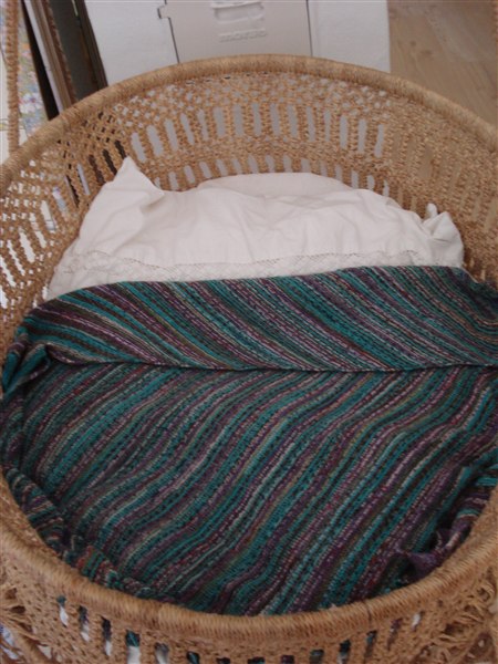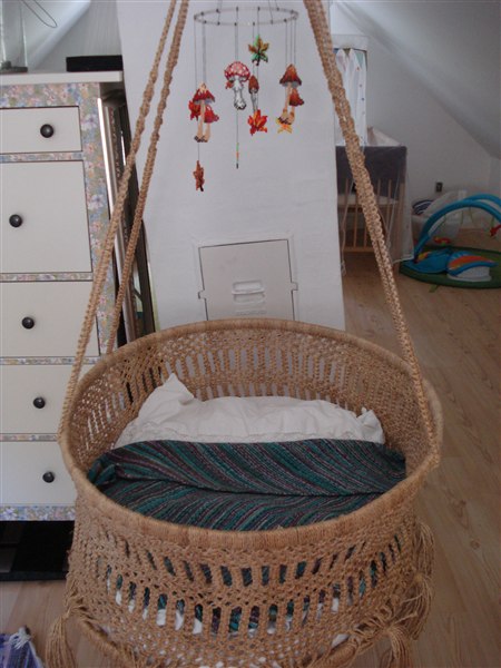 Her følger lige lidt billeder af den stoooore mave (Søren sagde i formiddags "årh! du ser bare helt vildt meget gravid ud!" - ja tak...man blir sgu snart heller ikke mere gravid end jeg er lige nu, fister!) og den fine vugge, med Helenes efterårsuro, Den utrolig yndige dyne fra Mette og min mors hjemmestrikkede babytæppe i