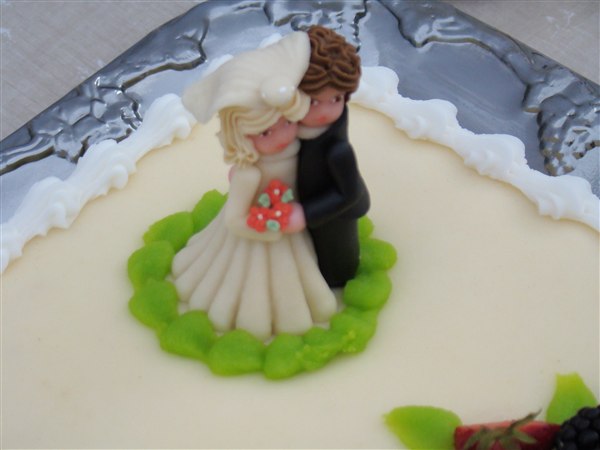 Lidt marcipan roser, frisk frugt og et brudepar.
