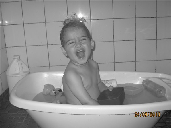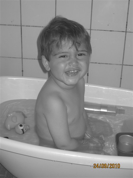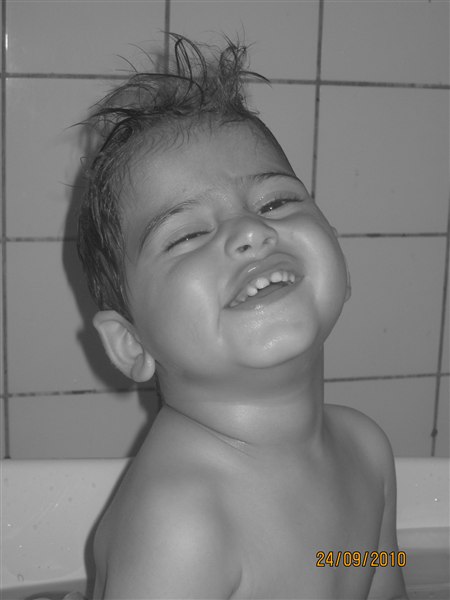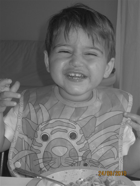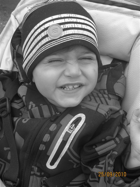 Min nevø på 2½ år laver næsten samme grimasse når han skal smile til kameraet.