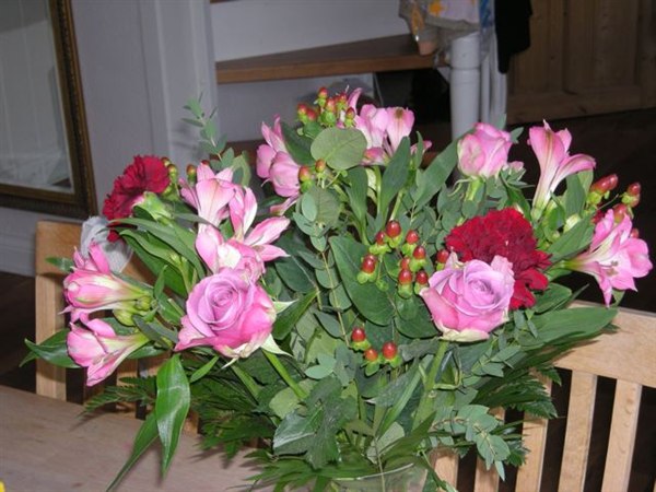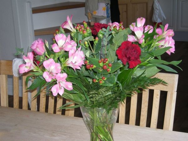 Da jeg kom hjem fra en ret svær arbejdsdag i går, lå der på min trappe en smuk buket. Der stod på det vedlagte kort " Fordi du er en ener" knus fra Trine og Malucca.