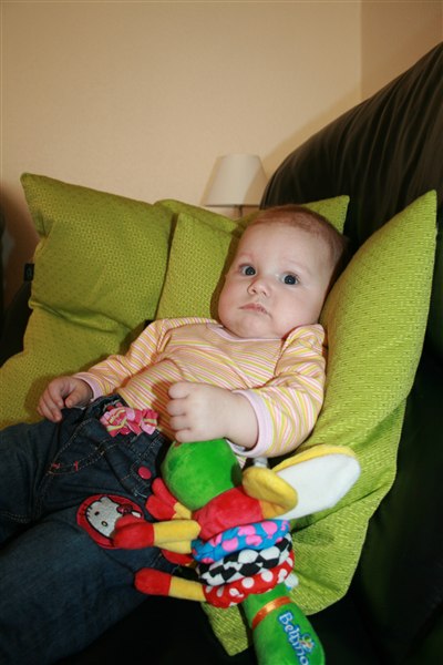 der sover man altså bedst. Og vi har ikke faste sengetider endnu. Det eneste der er indstuderet er vores formiddag og frem til klokken 12. Der sover Malou gerne 1 time eller 2 efter hun har leget om morgenen. Hun er allerede en ivrig seer på unge mødre og alt andet som moren ser i tv. Jeg har sjældent oplevet en baby der kan fokusere så meget og så længe på et tv.. Hun kan tilmed blive rasende hvis man stiller sig i vejen... for nu ser hun altså lige tv!! Fødderne har vi næsten opdaget, vi kigger i hvert fald intenst på dem når vi sidder op... meeeen vi har ikke grebet ud efter dem endnu.