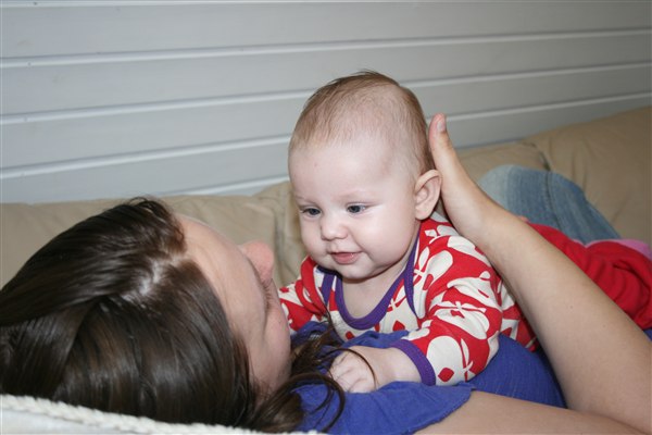 Vi har nu helt styr på hænderne og er begyndt at udforske ansigtet og mors hår (AV!!!) rigtig rigtig meget. Stilhed er en by i Rusland og hun snakker som et vandfald flere timer om dagen. Vi sover stadig imellem mor og far