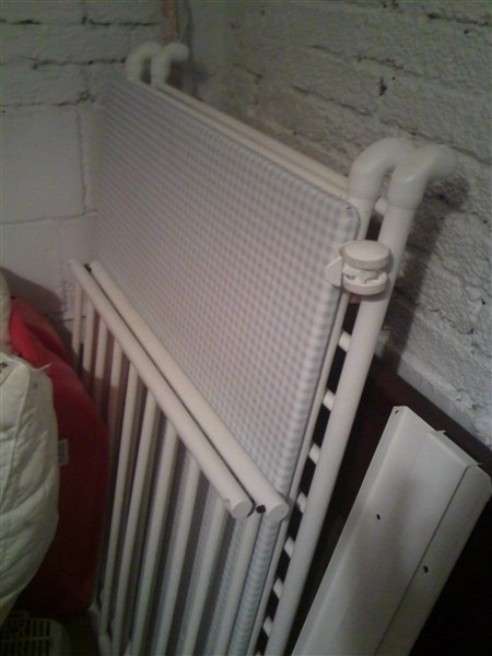 Hermed sælges en hvid kravlegård, hvis bund kan hæves og sænkes. Bunden er en træplade med en hvid/blåternet "voksdug". Nypris 800 kr.