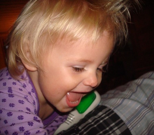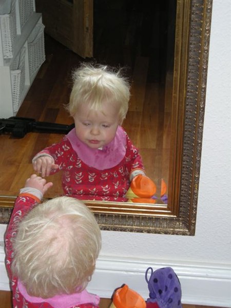 Ida spejler sig selv, og siger "ae, ae", mens hun aer spejlet.