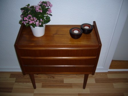Flot gammel retro kommode, med 3 skuffer - i teaktræ.