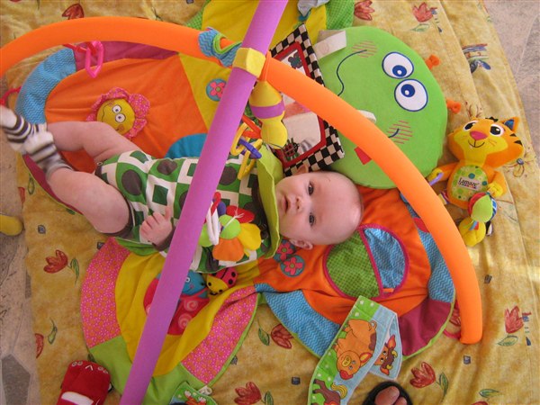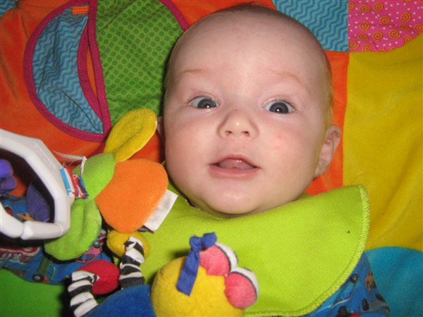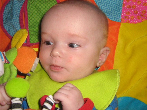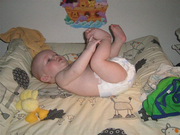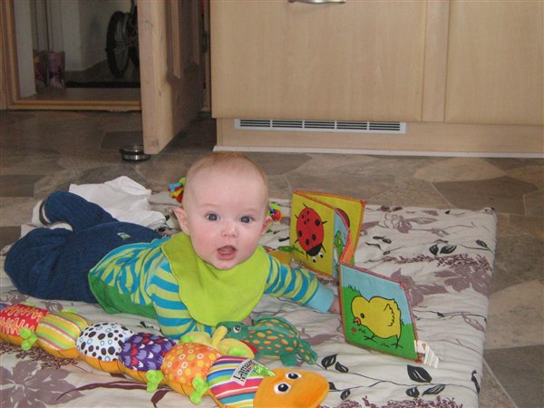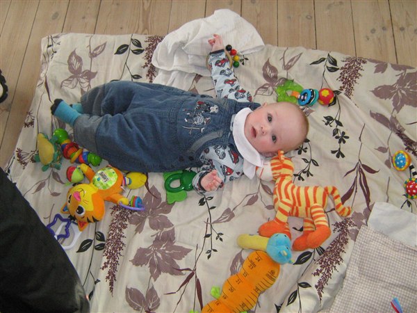 Hvor er han dog bare super sød! Flot, at han vender sig til begge sider, min datter på fire og en halv mdr., vender dig ikke rigtig fra nogen af siderne, men er godt på vej, og vender snart begge veje.. Men lige med det, er hun faktisk lidt bagud.. :/