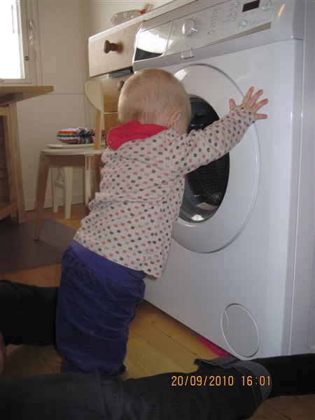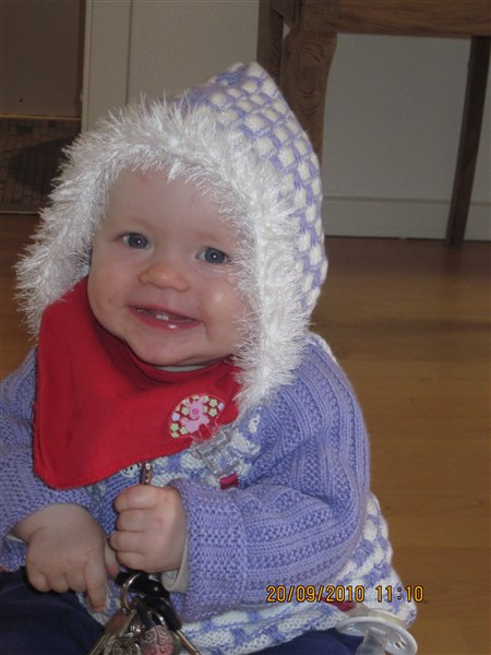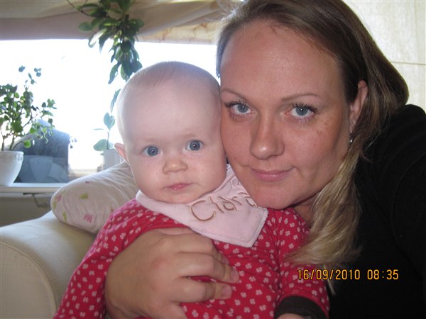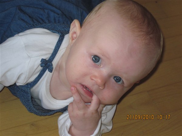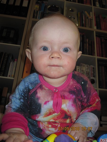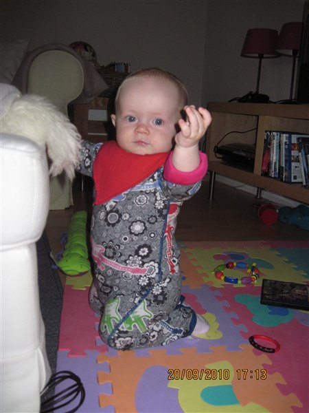 Clara er blevet 9 mdr. og mega fræk. Hun vælter rundt og roder i alt, har meget temperament, klapper hele tiden og siger mam mam mam ( prøver at lære hende at det er mad ). Og så er hun en kæmpe bangebuks for lyde, åhh det kan være belastende til tider.