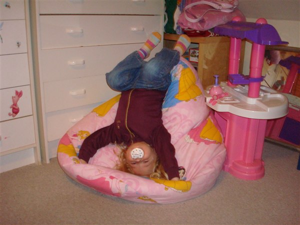 Så tag i stedet en måtte frem derhjemme, hvor hun kan slå kolbøtter, eller lad hende stå på hovedet op af en sækkestol eller lignende.