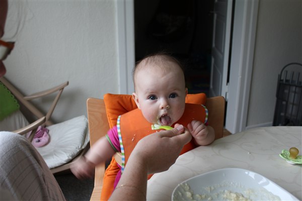 Jeg ammer hende stadig, men hun får også to faste måltider - frokost og aften og det fungerer rigtig fint!