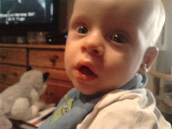 5 måneder, ud fra at han ser lidt lille ud, men han sidder jo næsten, så er lidt usikker - men du forsøger nok også at tricke os