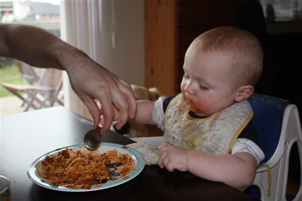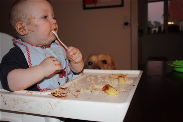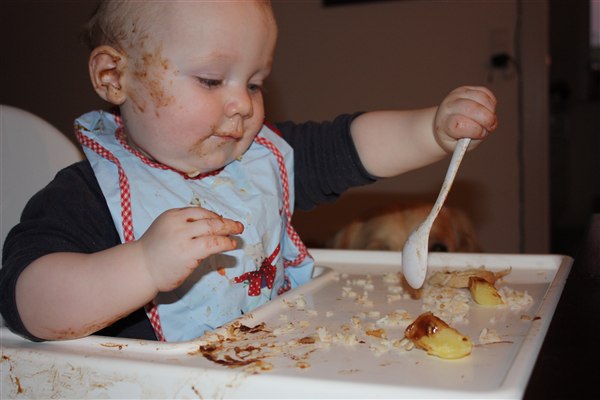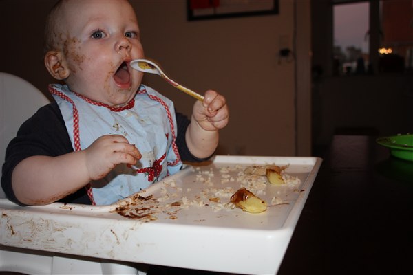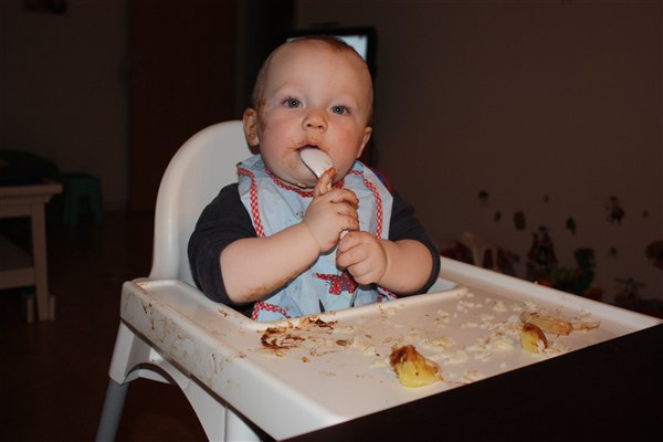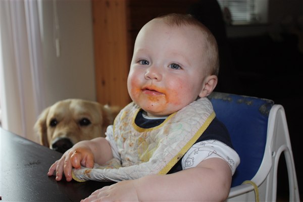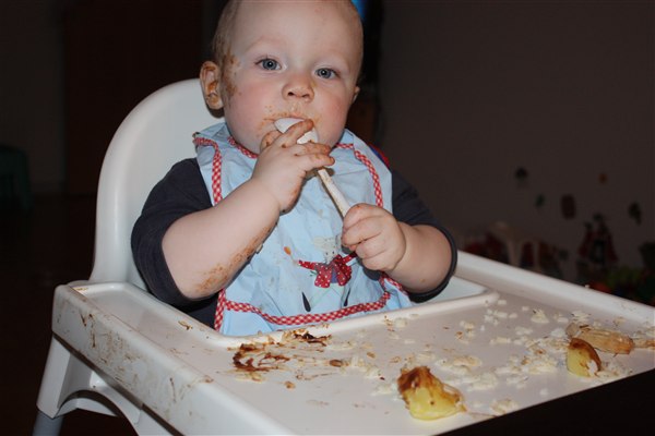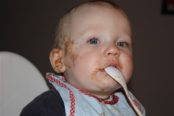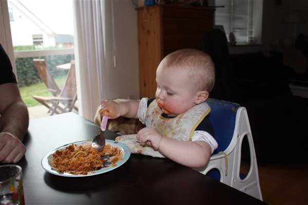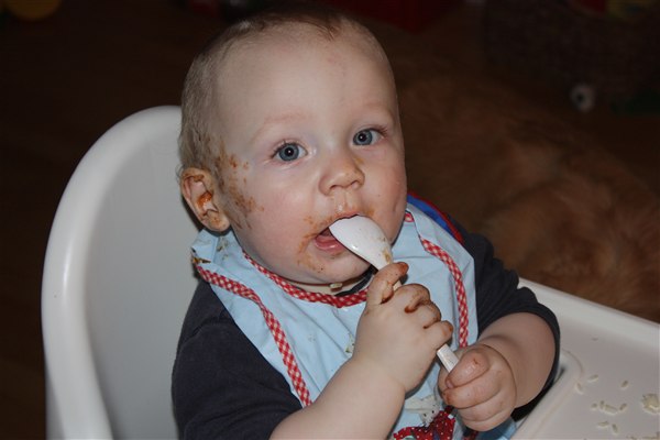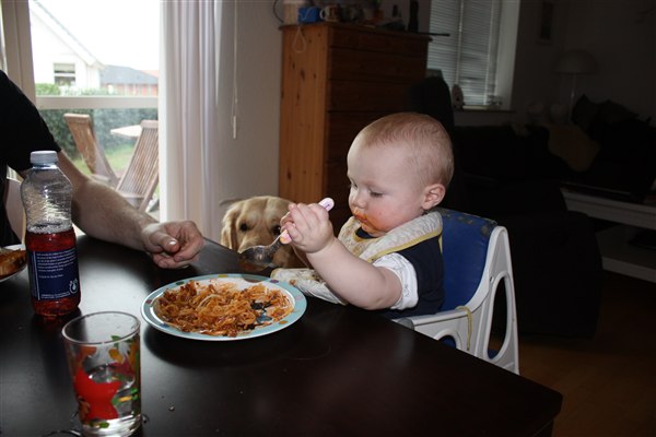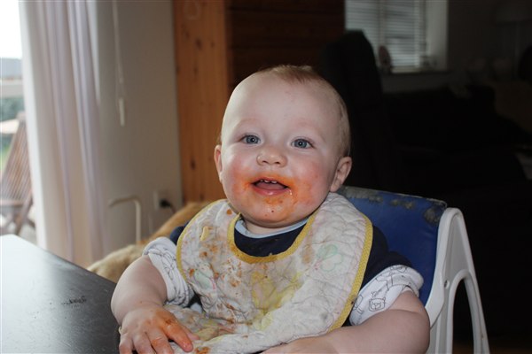 Hihi ja der bliver spist med både mund, næse og ører Sommetider også håret, så det er virkelig et held han stadig er lidt halv skaldet