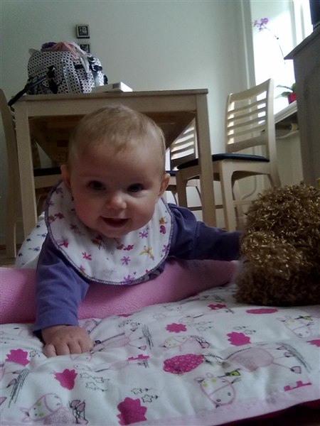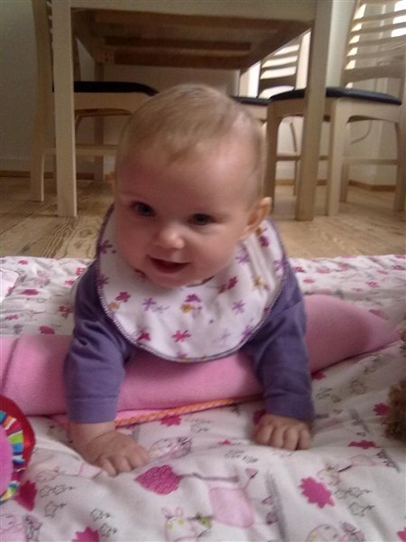 Det går også rigtigt godt. Hun er godt nok lidt mor-syg for tiden, men det er vist bare et tigerspring. Hun er begyndt at kravle nu, så det går alt alt alt for stærkt. Bøgerne i bogrolen er IKKE sikre mere, hi hi hi!