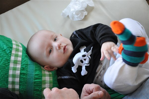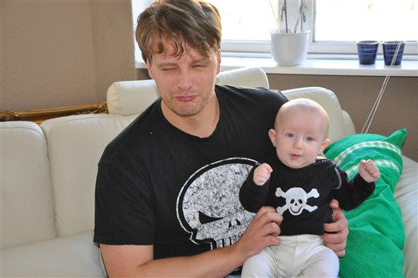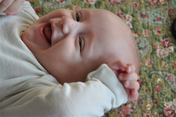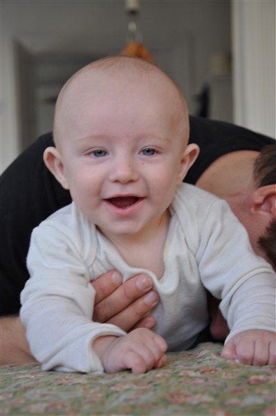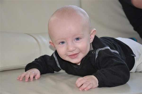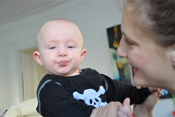 5,5 måned, smuk og varm og sjov og hidsig og kærlig Jeg elsker ham mere og mere for hver dag og der går ikke en dag uden at jeg bobler over af latter over et nyt udtryk, en lyd, et blik eller et hysterisk anfald Han er bare det bedste! Med stjerner og narrestreger i øjnene og bekymring over hans fine pande har han skrålet sig helt ind i min sjæl med sit evindelige "AAAAAIIIII ØWØWØØØØWWW!" og de store våde..kys (?)