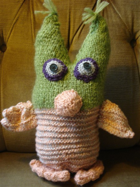 Nåh men Mormor havde selvfølgelig gave med til Baby Juhl, hjemmestrik som altid (det BEDSTE!): denne fantastisk grimme og helt utroligt skønne ugle! Om aftenen sad Søren med den ude i den anden stue og spørger "hvad hedder uglen?". Normalt er det Søren der navngiver dyr osv herhjemme, så jeg kom bare med sådan et halvlamt svar "...Ulrik?". "jae, se jeg troede også først det var en dreng, men jeg er ikke så sikker....nej, det ER en pige...den hedder....Ella!" - hvorefter Ella brød spontant ud i sang "Jeg er Uglen Ella, Ella, Ella, eh eh eh!" (nogle kan måske genkende melodien??)