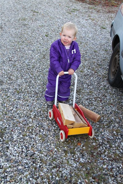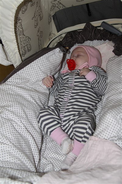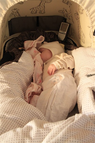 Ja, det er barnevognen med voksi miraklet i. Jeg er ved at lære hende at når hun bliver lagt i den, skal hun lægge sig til at sove med det samme - det virker allerede i 70% af tilfældene. De 2 øverste er fra i dag og da jeg lagde hende i posen i vognen gemte hun bare hovedet i kramme bleen og lukkede øjnene. Jeg nåede ikke engang at pakke hende ind før hun sov. Dejligt.