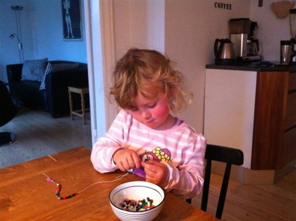 Og det har overrrasket mig, at hun er så stillesiddende i sine aktiviteter som hun har vist sig at være. For Bianca er ellers en bulder-basse, som elsker at hoppe omkring og tumle. Men henne i børnehaven, dér foretrækker hun at tegne med tusser (christ hvor er der kommet mange tegninger med hjem, siden hun startede der, hehe), og så laver hun perle-armbånd og bygger med sådan nogle samle-brikker, og leger med modelervoks.....sådanne ret stille-siddende aktiviteter.