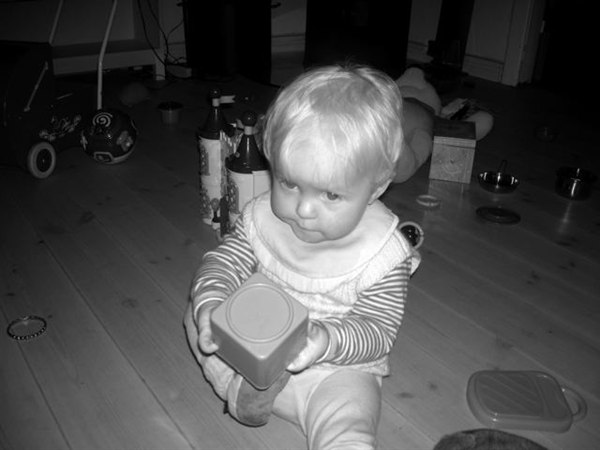 Billede 6, prøver hun at få klodsen på foden mens hun siger "Go, go" ( Sko, sko).