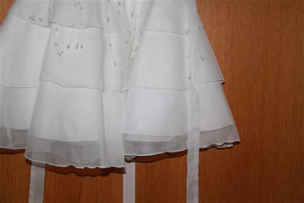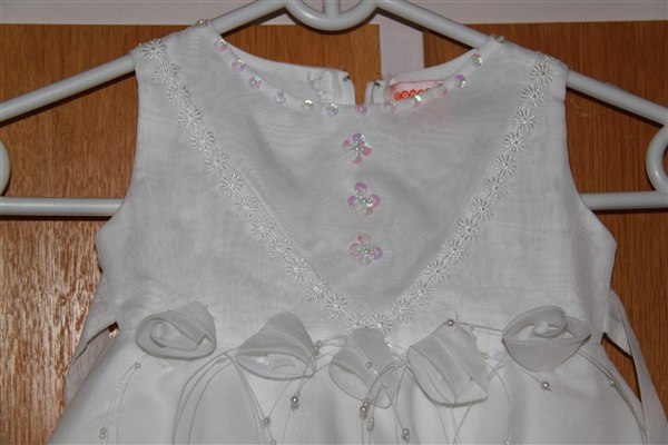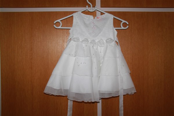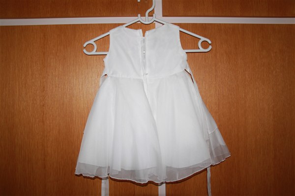 Der står ikke størrelse i kjolen, men jeg gætter på en 80/86 eller deromkring. Den kan bindes ind i ryggen og er ikke for lang, så en størrelse fra eller til betyder ikke det store.