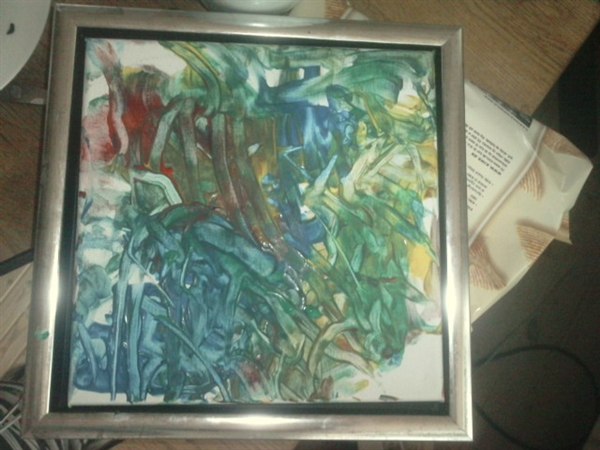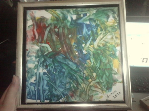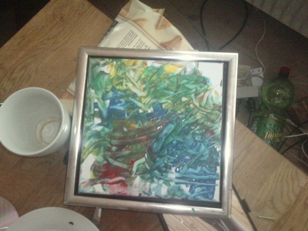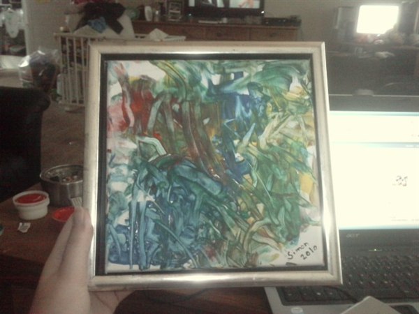 Vi fik et lille kunstværk ud af det i stedet. Og tro det eller ej, det eneste vi gjorde var at komme fingermaling i hænderne på ham og holde lærredet, resten klarede han selv