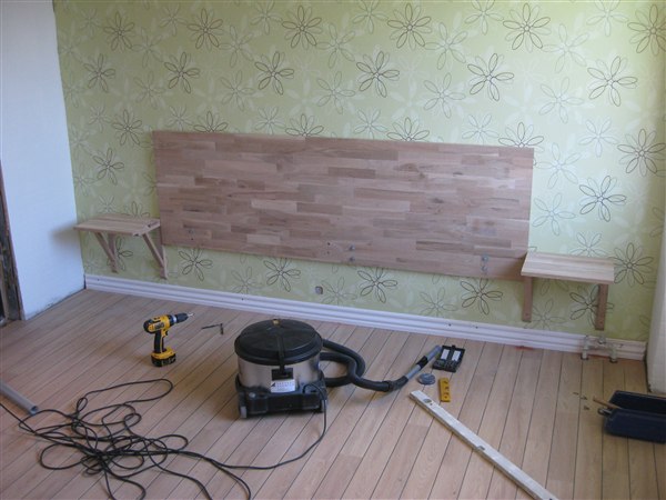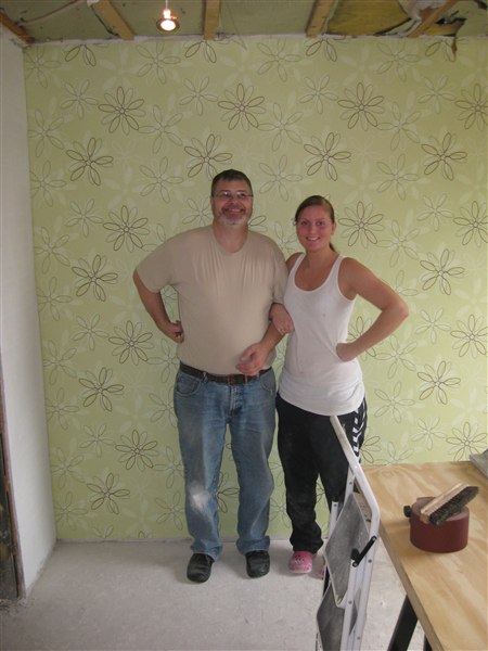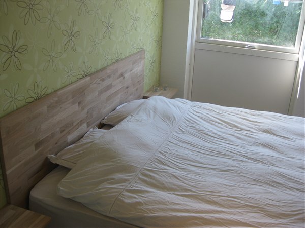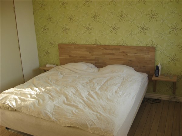 Måske nogle malerier eller noget fotokunst på væggene? Ellers skønt og lyst soveværelse i har fået jer. Er det forresten din far du står sammen med på billedet?
