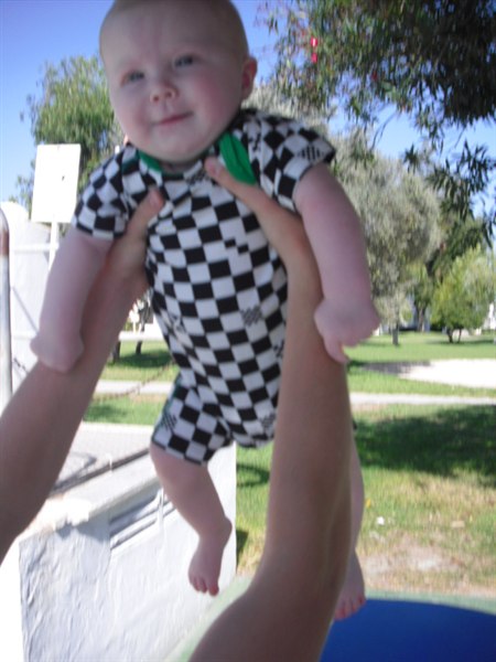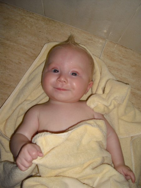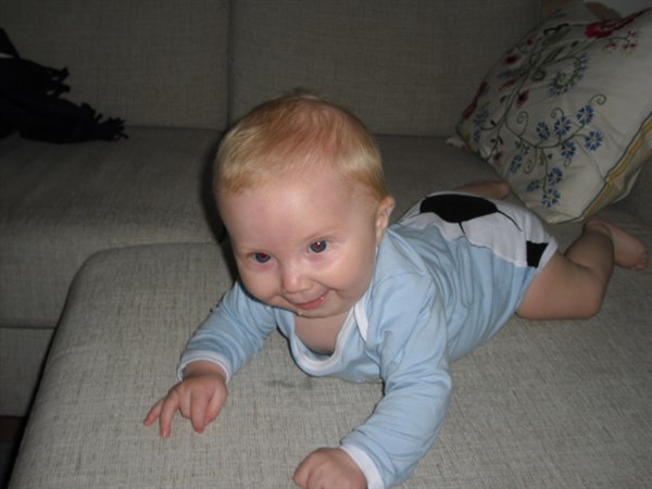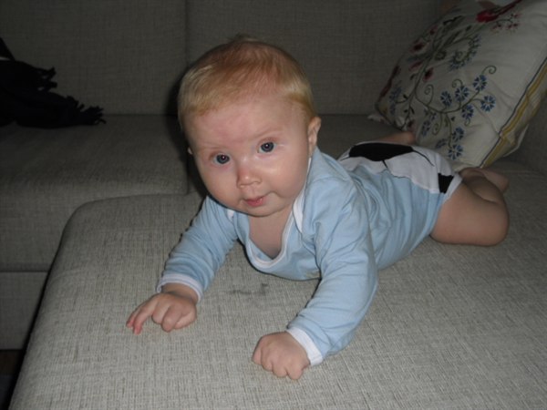 (Får sq ondt i armene). Igår vente han sig for første gang fra mave til ryg, dygtig