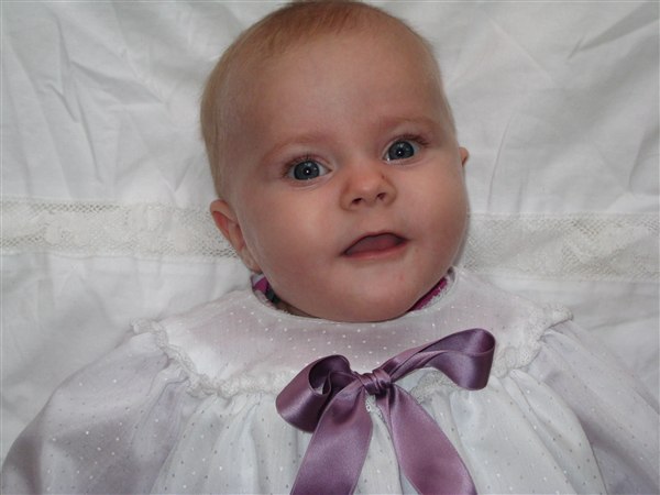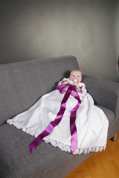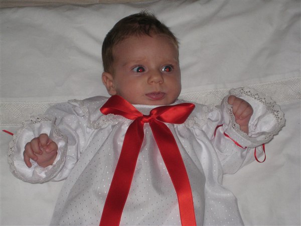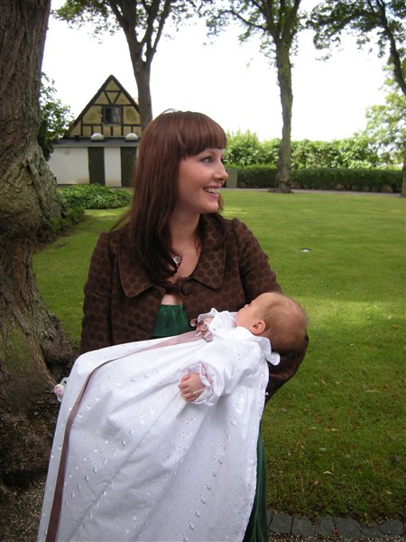Min mor og jeg syede dåbskjole, da min ældste datter skulle døbes...tanken er, at den skal være familie-dåbskjole - den er syet fra bunden. Kniplingerne har min dejlige bedstemor lavet - udover dem er kjolen meget enkel. Vi syede en meget enkel underkjole til i ren bomuld og uden ærmer - så den er meget enkel. Pigerne har begge haft en hvid langærmet body og hvide strømpebukser på under kjolen. De har ingen kyse haft på - og intet på fødderne, der jo var gemt godt væk i den lange kjole