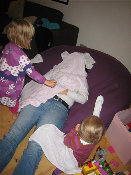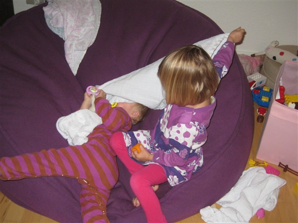 På de billeder, hvor Pelle og jeg ligger ned på sækkestolen legede Annika, at vi var giftige, så hun skulle have gummihandsker på, og vi skulle dækkes helt til med stofbleer