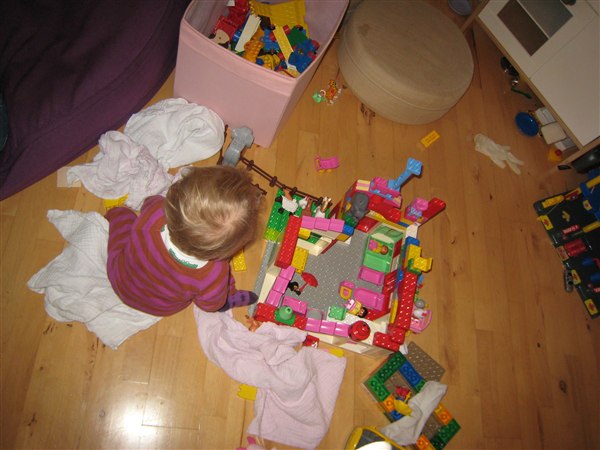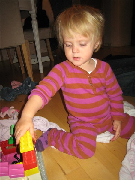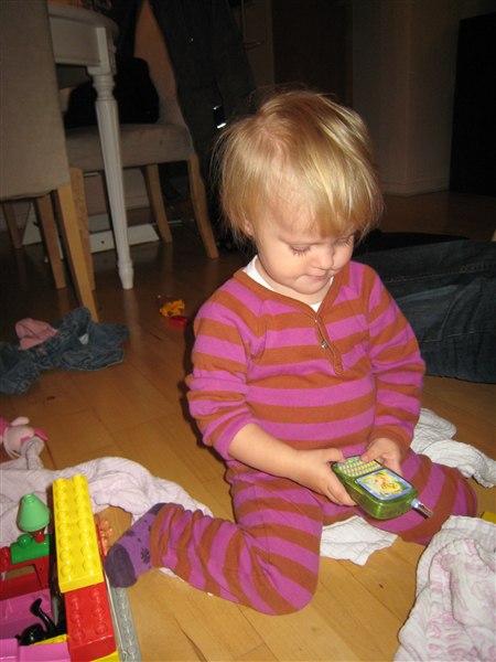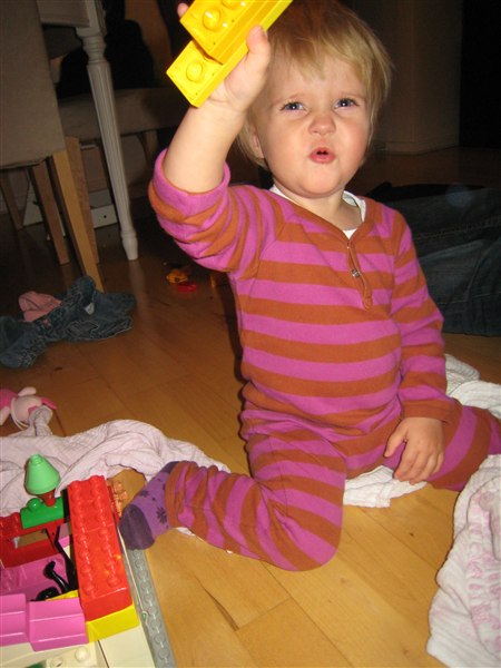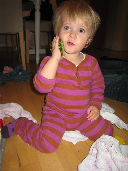Lina byggede med klodser, mens Pelle og jeg skiftedes til at være giftige - og hun fik som billedet vidner om også sagt "hallO" i en telefon
