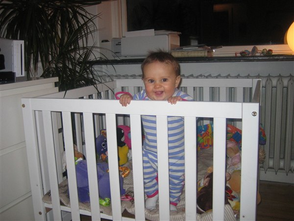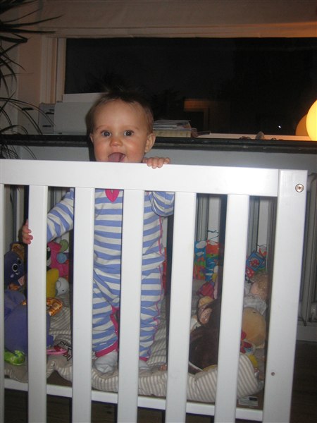 Igår fik vi sat kravlegården og tremmesengen en tak ned da Ida syndes det er vildt sjovt at rejse sig op. Af frygt for at hun kunne falde ud satte vi dem ned, og det virker ikke som om frøkenen syndes der er vildt irrirterende.
