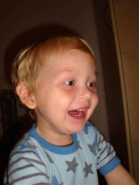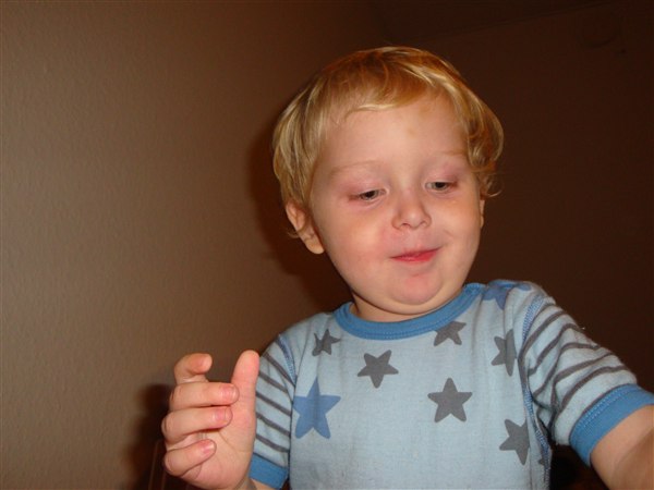 Billede 2+3: I går aftes, 23.30 hørte jeg pludselig små trippende skridt og et klik. Da jeg gik ind for at se efter var Elias stået op, havde tændt lyset og var i fuld gang med at lege -møgunge
