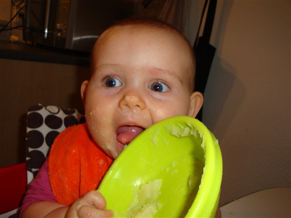 Billede 9-12: Alberte fik lov til at lege med ske og tallerken efter aftensmaden, det var vidst ret sjovt