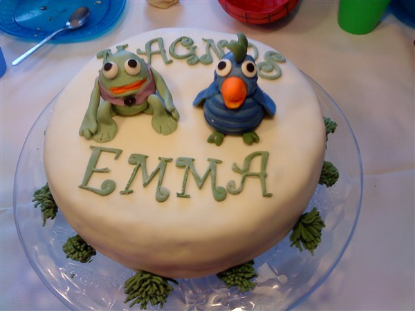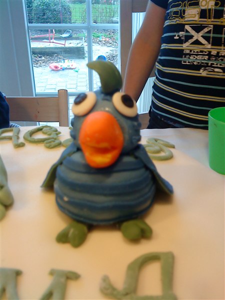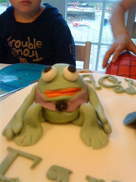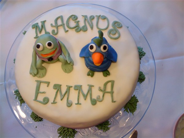 Det er chokoladelagkagebunde men med hakkede nødder og hakket chokolade i, og så lagt sammen med solbærsyltetøj og flødecreme