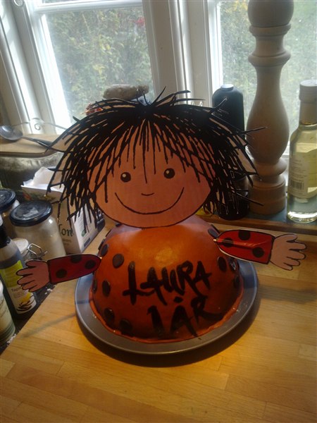 Den anden fødselsdag: Min veninde (trissemusen)s Laura bliver 1 år på onsdag. Hun er en rigtig lille cirkeline og jeg lod mig inspirere af hende. Jeg fik simpelthen et billede af min cirkeline kage i hovedet. Satte husbonni til at photoshoppe baghovedet af cirkeline og spejlvendte arme, så jeg kunne lave mit dukkehovede og dukkearme på pind