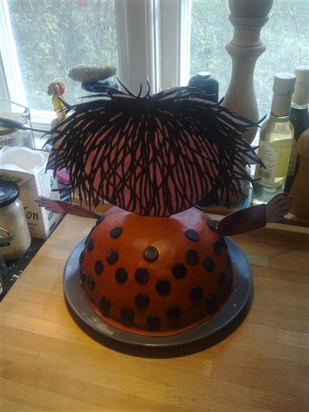 YAY - det blev HELT perfekt, bortset fra jeg var løbet tør for RØD-RØD farve, så den blev lidt sær rød, men det passede nu meget godt. - Da jeg ankom med kagen, passede det NÆSTEN ligeså perfekt til pynten, fordi der var røde prikkede mariehøne balloner overalt. hehe... Men cirkeline faldt i SUPER god jord