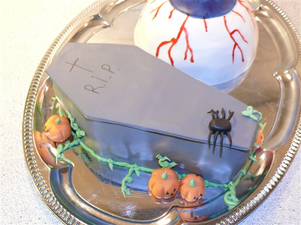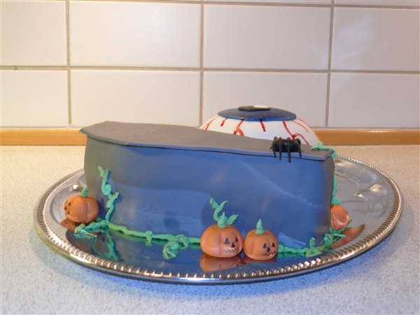 Så er vi lige kommet hjem fra Halloweenfest på min store drengs skole. Hver familie skulle have en kage med til et stort kagebord. Men han kunne ikke helt bestemme sig så bestillingen kom til at lyde på to mindre kager så ! Begge kager består af 3 chokoladekagebunde, bærsymfonimousse og hvid tobleronecreme.