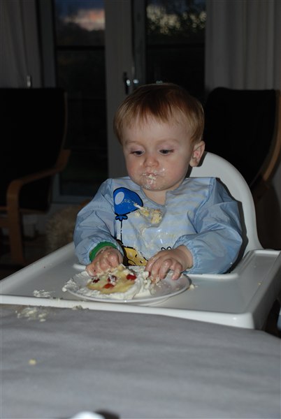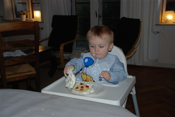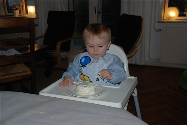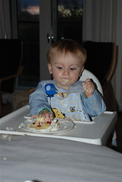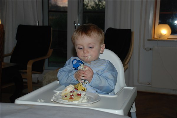 Han fik som tradition sin egen lille lagkage. Jeg var slet ikke i tvivl om at han nok sku gå til angreb på den for herhjemme skal der også fedtes godt med maden i hænderne, lige indtil mor siger man ska spise pænt. Men det var jo lykken at få LOV til det dan dag :-)