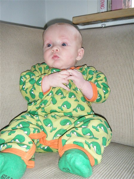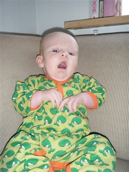 Han sover bedre og bedre - helt op til 4 timer ad gangen når vi er RIGTIG heldige. Også er han en stor hængetrold - hvilket jo egentlig er meget hyggeligt, men man får ikke lavet så meget andet end at bære rundt på ham.