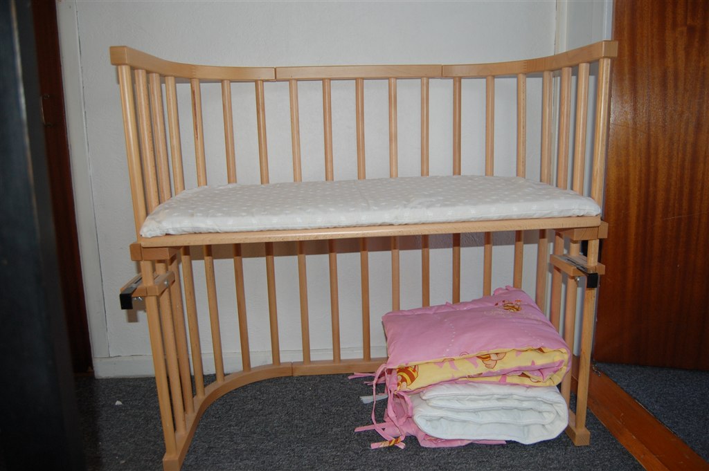 Der følger madras, lagn, sengerand i original med og så har jeg lige lagt noget pige noget ved en sengerand, dyne og pudebetræk. Der er lyserødt med små bier , men altså ikke originalt.