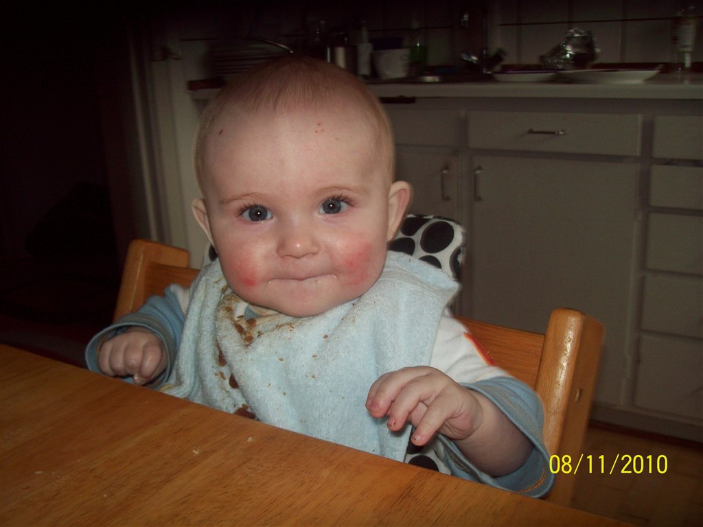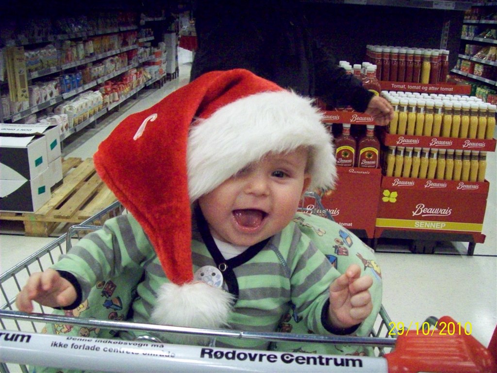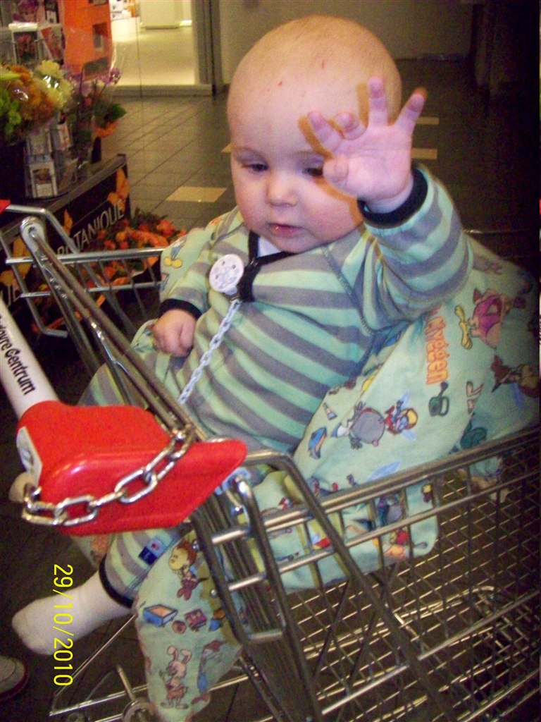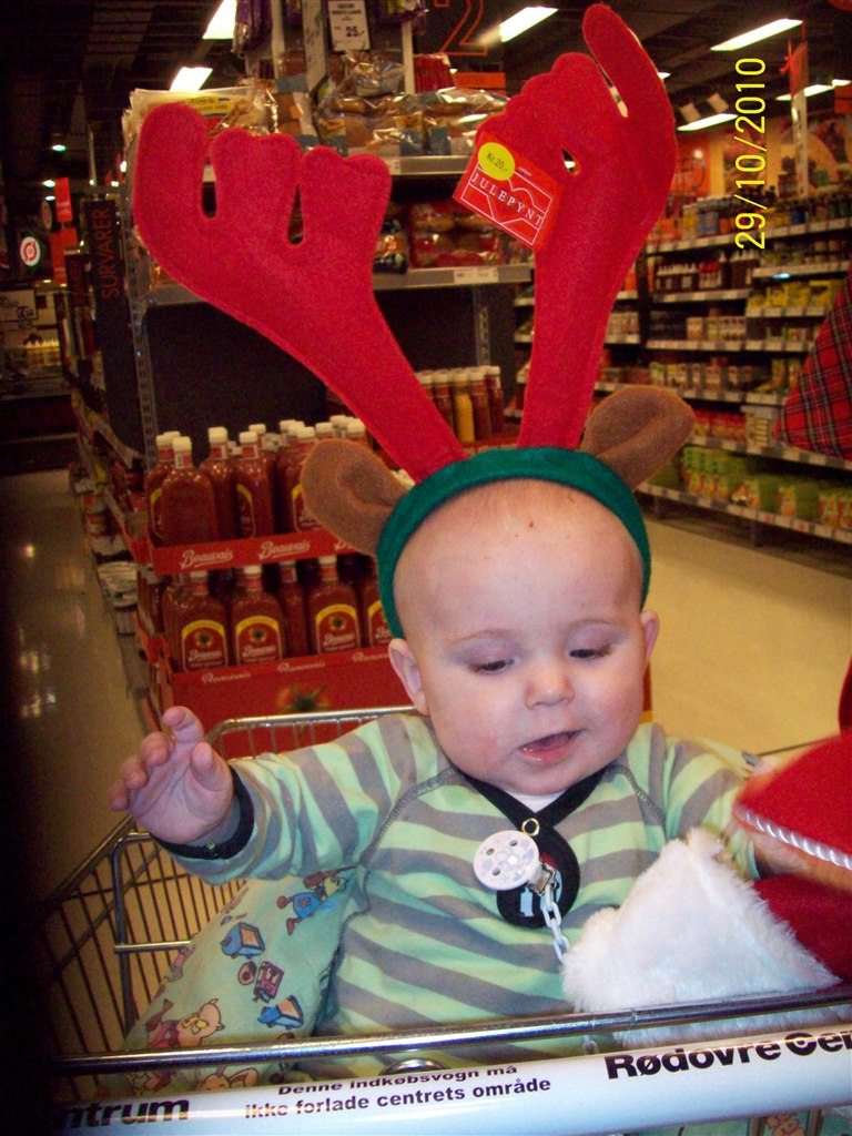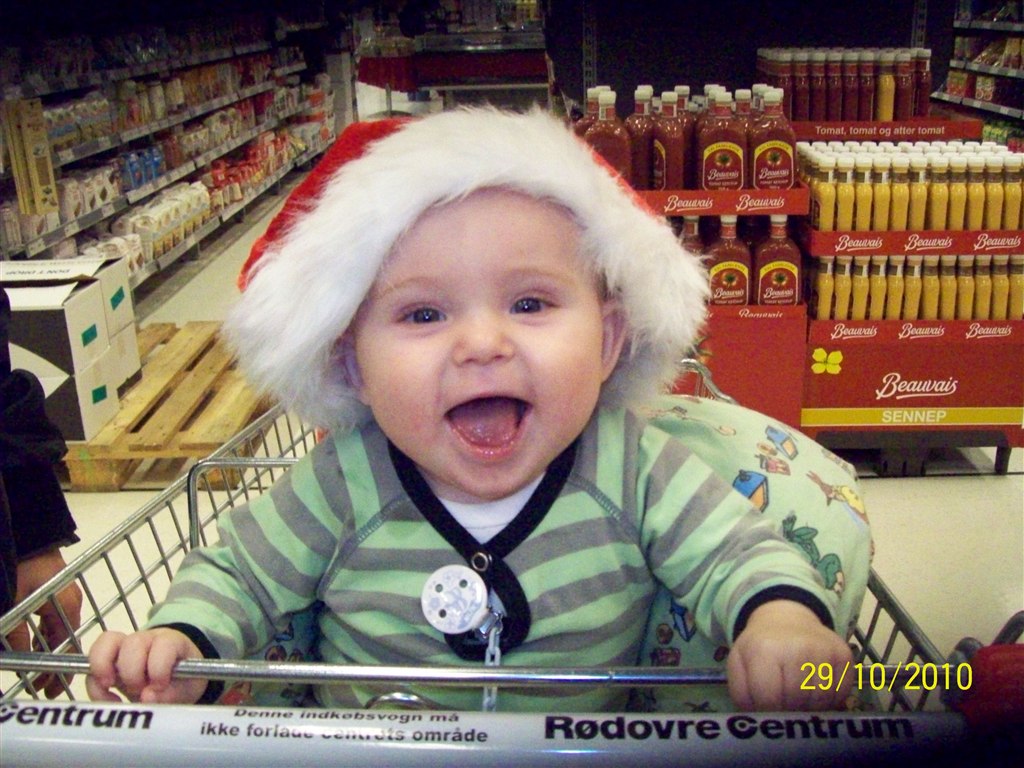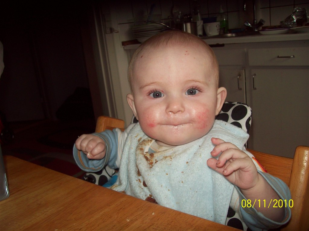 Han vokser fint og spiser godt, han vil gerne spise selv og drikke af kop, han sover hele natten fra 19-7, men nogen gange lidt piveri, når han har mistet sutten.