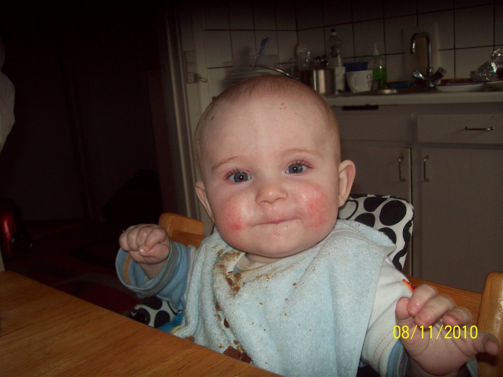 Ja eksem..... Cassandras har det ok lige for tiden, det er stadigvæk kun hænderne der er et problem. Julius' har vi ikke rigtig kunne komme af med den sidste måned, hvis det gik væk på kinderne kom det bare et andet sted. Fordi vi i 3 dage ikk ehavde givet ham en savlesmæk på, ja så fik han et stort grimt eksem på brystet, det gik væk efter et par dage med savlesmæk på og smøring, bare for at det kom igen på kinderne.
