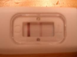 Da der var gået 30 sekunder, kom der en lille utydelig lyserød streg frem på T siden. (test siden), og den blev mere og mere tydelig. Den var stadig ikke helt tydelig, men den var der sgu uden tvivl.. da det 3. minut gik, præcis, kom der den her tydelige streg ovre på C siden (kontrolsiden) og her stod jeg så.. med en helt klar streg og en lettere utydelig streg.
