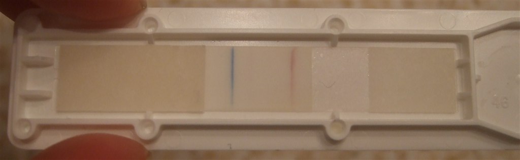 Det er en quickvue test. Jeg har skilt den ad, for nemmere at fange stregen på kamera. Den blå streg til venstre er kontrolstregen. Den tydelige røde streg til højre var under plastik-skjoldet. Den jeg tror jeg ser er en SVAG rød streg ved siden af den blå.