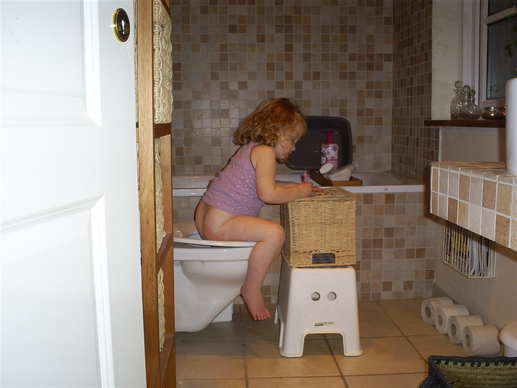 Det kan da også være temmelig kedeligt at sidde på toilettet - så det er SLET ikke så dumt det hun har gang i der...