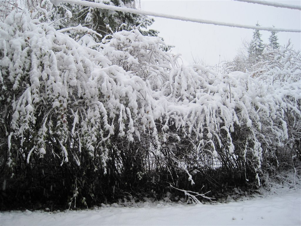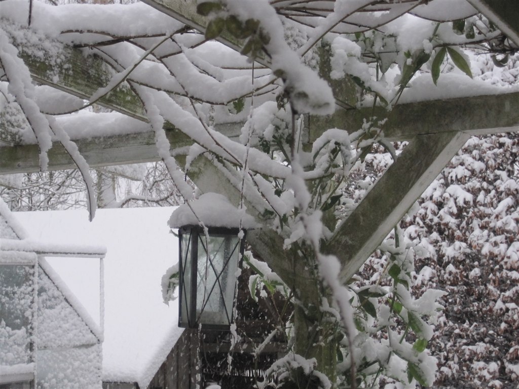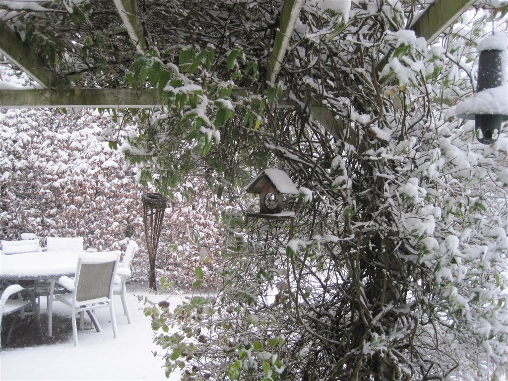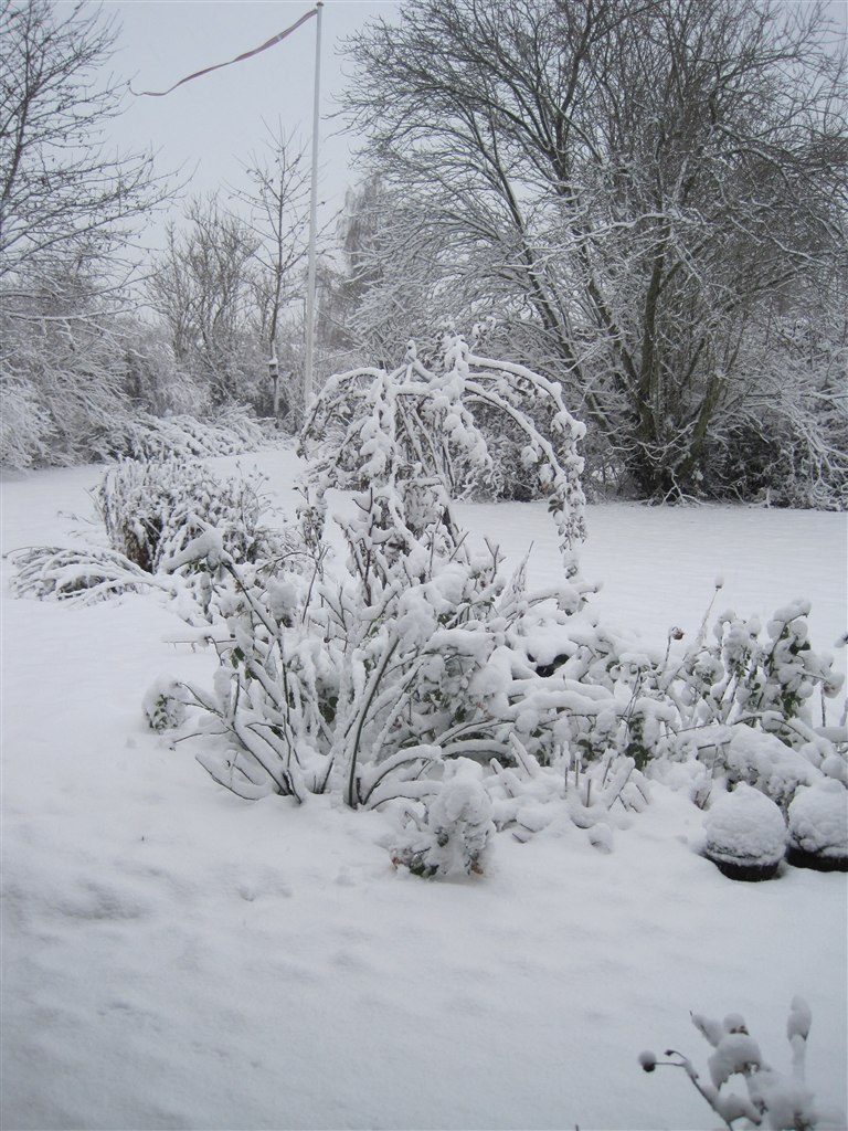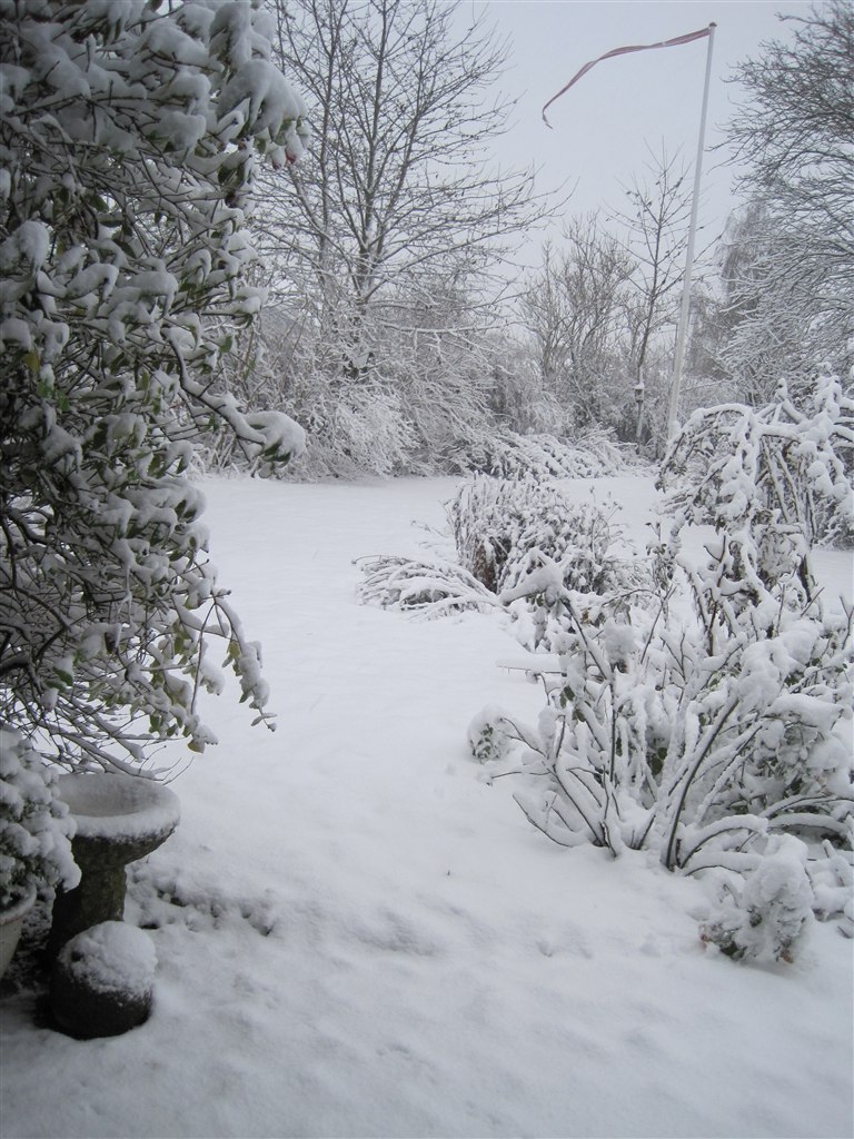 Sådan ser det ud i mine forældres have - og det sner stadig meget tæt: