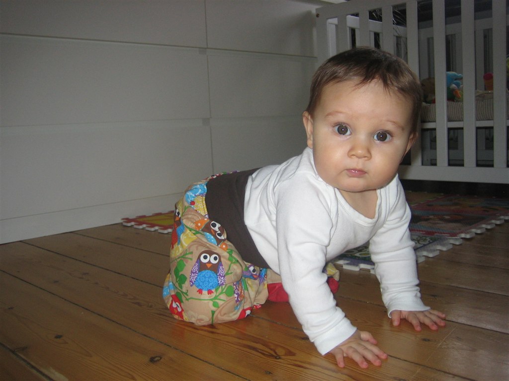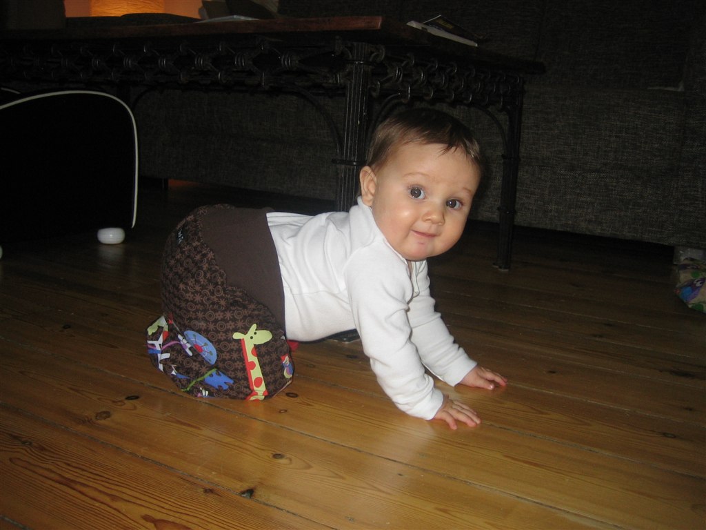 Derudover er hun begyndt at kravle. Og det går stærkt. Hun kravler, og kravler.Hun gør det at hun kravler over til noget hvor hun kan stå op og så rejser hun sig. Når jeg forlader rummet kravler hun efter og når hun når mig så............. vupti.....................så står hun op ad mig. Så nu er der fart over hende.